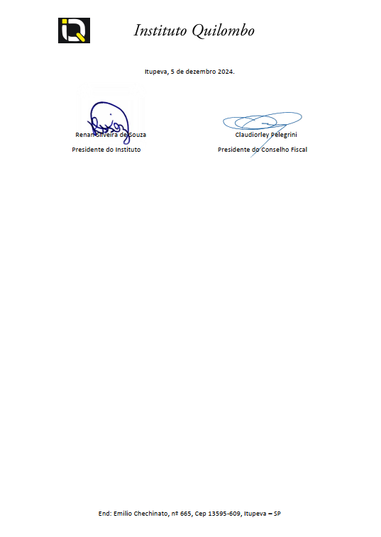 A Instituto Quilombo, com sede na Emilio Chechinato, nº 665, Cep 13595-609, Itupeva – SP, neste ato representada por seu Presidente Renan Silveira de Souza, vem CONVOCAR, por meio do presente edital com base em seu estatuto conforme Art.17, item I, que trata: reunir-se-á, extraordinariamente, sempre que se faça necessário convocar todos os seus membros e interessados, para a Assembleia Geral Extraordinária, deste Instituto, que será realizada no dia 19/12/2024 (quinta-feira) às 17h00 em sua primeira chamada, com a presença de 2/3 dos seus associados, e em segunda convocação as 17h30 com 50% mais de seus associados, e em sua terceira e última chamada as 18h00 com um mínimo de 10(dez) associados presentes com a seguinte ordem do dia:
