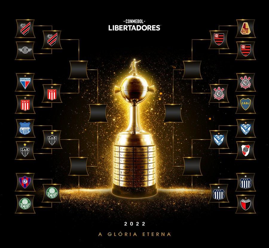 Na Libertadores ainda tem 5 times brasileiros, sendo que quatro deles vão se enfrentar: o Atlético-MG vai encarar o Palmeiras; e o Flamengo vai duelar contra o Corinthians. Já o Athletico vai enfrentar o Estudiantes-ARG. E haverá um confronto de argentinos, entre Vélez e Talleres.